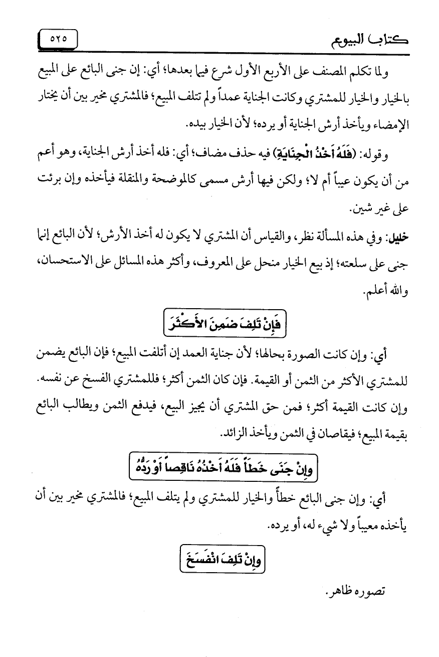 ولما تكلم المصنف على الأربع شرع فيما بعدها، أي: إن جنى البائع على المبيع بالخيار والخيار للمشتري وكانت الجناية عمداً ولم تتلف المبيع، فالمشتري مخير بين أن يختار الإمضاء ويأخذ أرش الجناية أو يرده، لأن الخيار بيده.