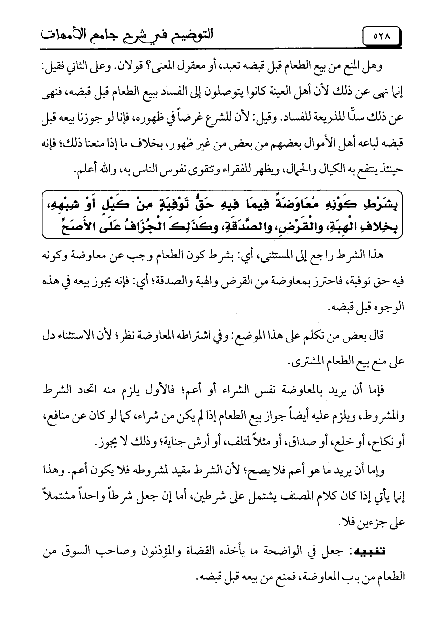 فإما أن يريد بالمعاوضة نفس الشراء أو أعم، فالأول يلزم منه اتحاد الشرط والمشروط، ويلزم عليه أيضاً جواز بيع الطعام إذا لم يكن من شراء، كما لو كان عن منافع، أو نكاح، أو خلع، أو صداق، أو مثلاً لمتلف، أو أرش جناية، وذلك لا يجوز.