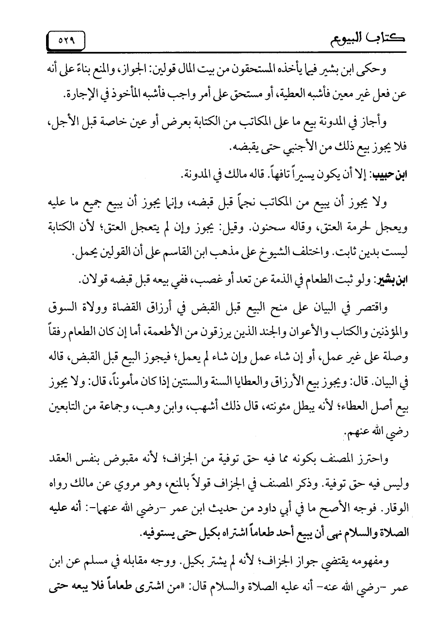 واقتصر في البيان على منح البيع قبل القبض في أرزاق القضاة وولاة السوق والمؤذنين والكتاب والأعوان والجند الذين يرزقون من الأطعمة، أما إن كان الطعام رفقاً وصلة على غير عمل، أو إن شاء عمل وإن شاء لم يعمل، فيجوز البيع قبل القبض، قاله في البيان. قال: ويجوز بيع الأرزاق والعطايا السنة والسنتين إذا كان مأموناً، قال: ولا يجوز بيع أصل العطاء، لأنه يبطل مئونته، قال ذلك أشهب، وابن وهب، وجماعة من التابعين رضي الله عنهم.