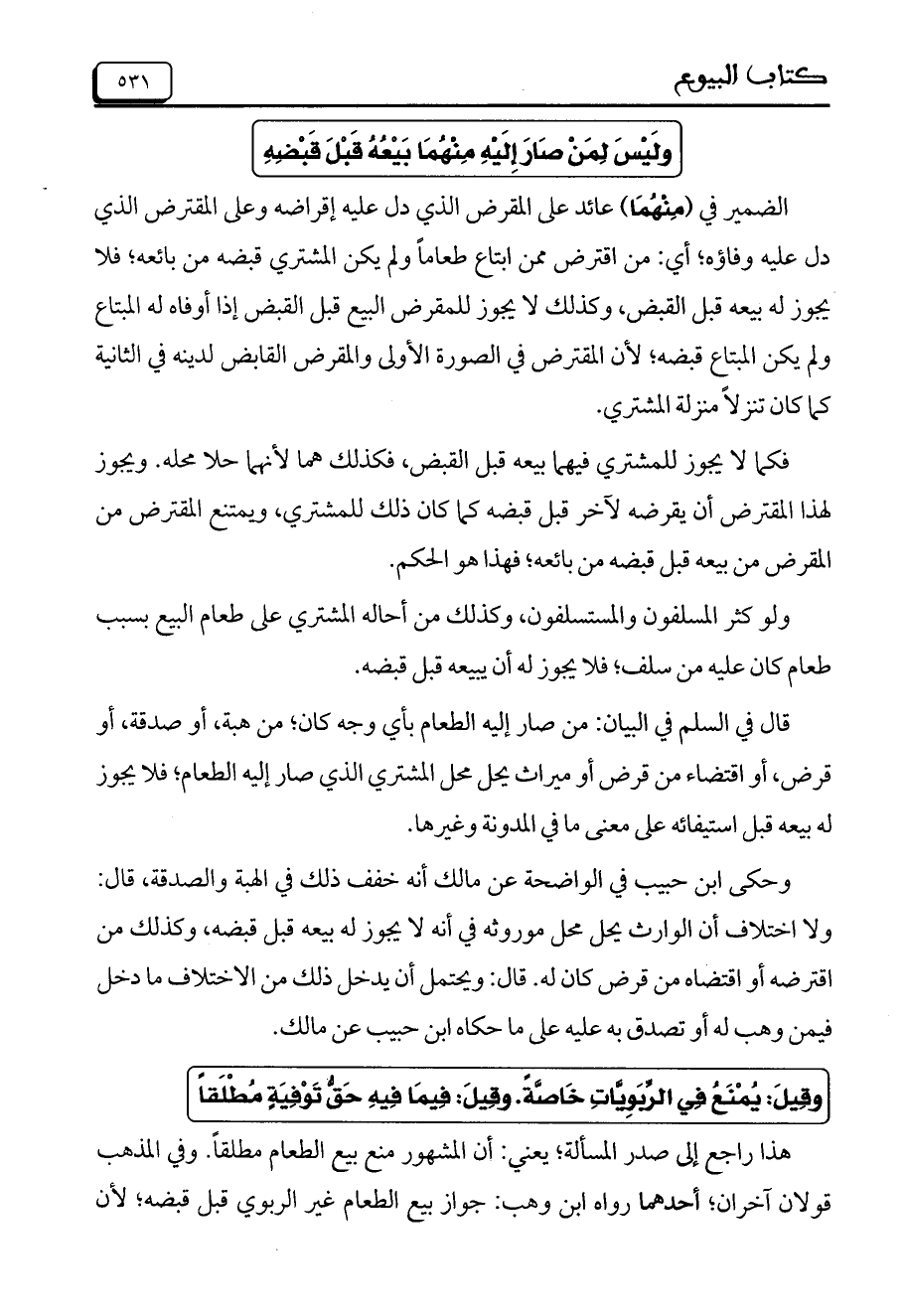 هذا راجع إلى صدر المسألة، يعني: أن المشهور منع بيع الطعام مطلقاً. وفي المذهب قولان آخران، أحدهما رواه ابن وهب: جواز بيع الطعام غير الربوي قبل قبضه، لأن