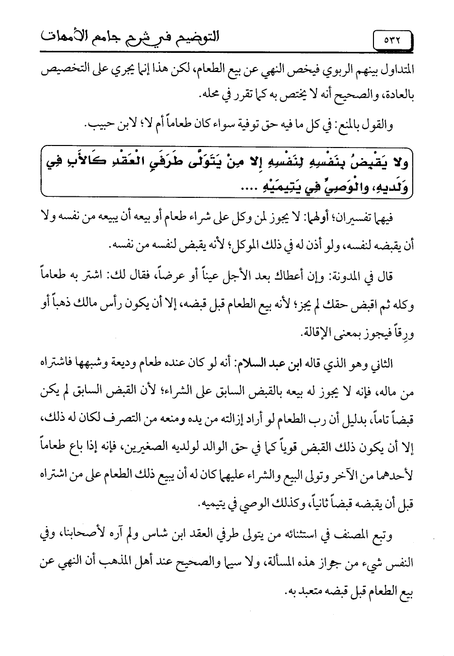 وتبع المصنف في استثنائه من يتولى طرفي العقد ابن شاس ولم آره لأصحابنا، وفي النفس شيء من جواز هذه المسألة، ولاسيما والصحيح عند أهل المذهب أن النهي عن بيع الطعام قبل قبضه متعبد به.