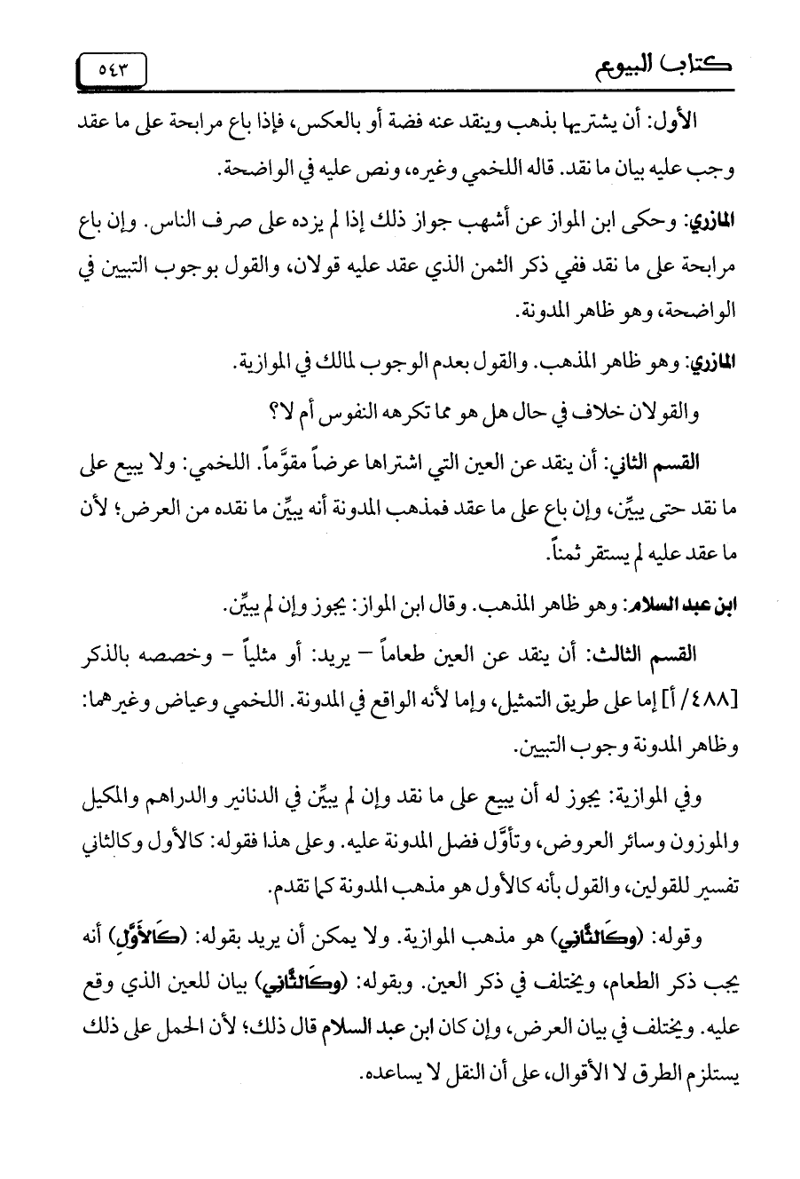 القسم الثالث: أن ينقد عن العين طعاماً- يريد: أو مثلياً- وخصصه بالذكر [488/أ] إما على طريق التمثيل، وإما لأنه الواقع في المدونة. اللخمي وعياض وغيرهما: وظاهر المدونة وجوب التبيين.