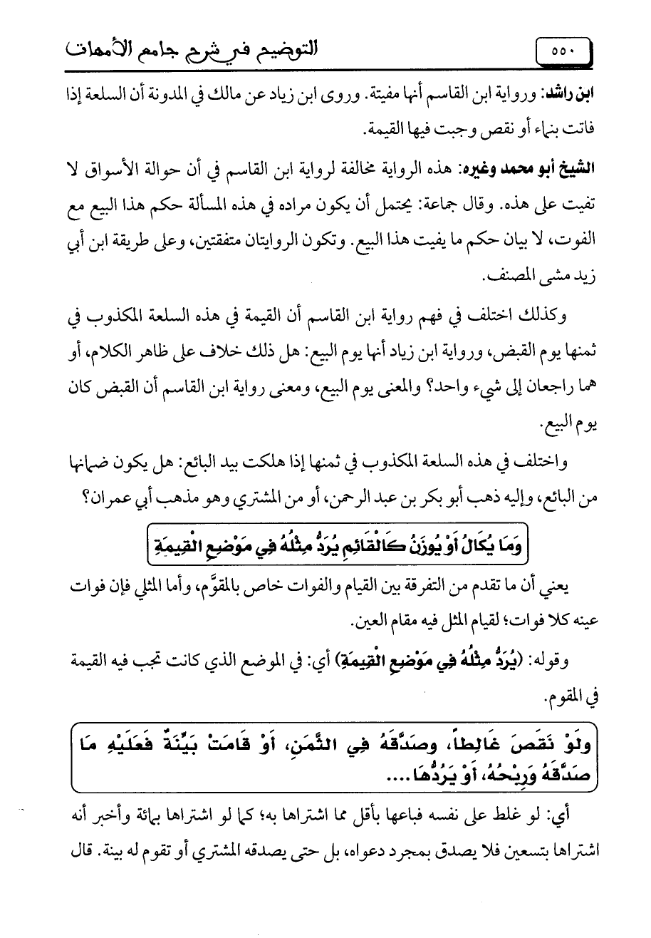 ابن رشد: ورواية ابن القاسم أنها مفيتة. وروى ابن زياد عن مالك في المدونة أن السلعة إذا فاتت بنماء أو نقص وجبت فيها القيمة.