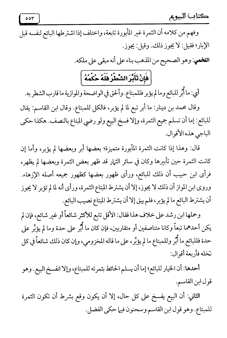 الثاني: أن البيع يفسخ على كل حال، إلا أن يكون وقع بشرط أن تكون الثمرة للمبتاع. وهو قول ابن القاسم وسحنون فيما حكى الفضل.
