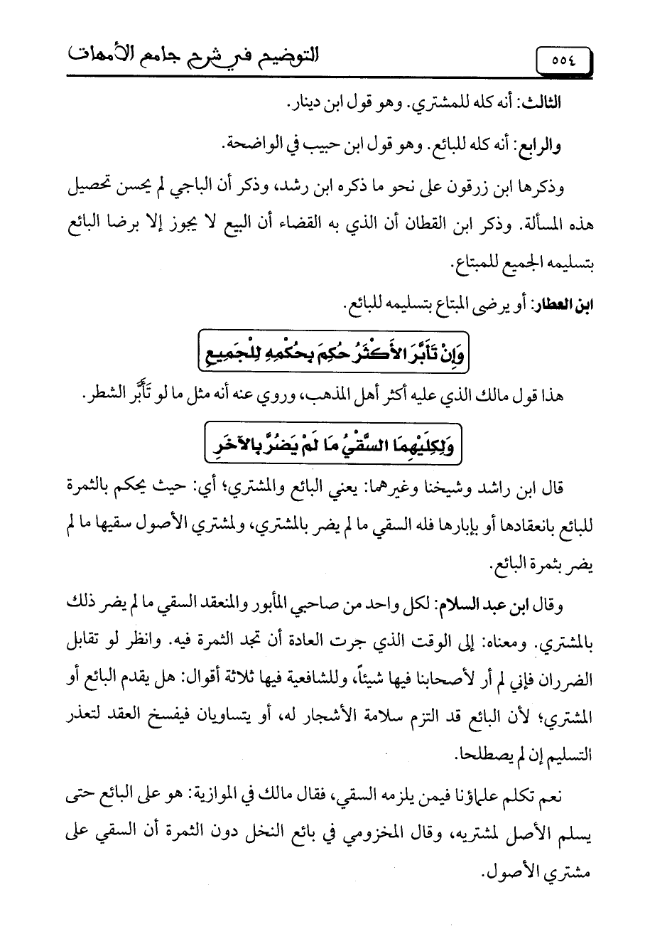 وقال ابن عبد السلام: كل واحد من صاحبي المأبور والمنعقد السقي ما لم يضر ذلك بالمشتري. ومعناه: إلى الوقت الذي جرت العادة أن تجد الثمرة فيه. وانظر لو تقابل الضرران فإني لم أر لأصحابنا فيها شيئاً، وللشافعية فيها ثلاثة أقوال: هل يقدم البائع أو المشتري، لأن البائع قد التزم سلامة الأشجار له، أو يتساويان فيفسخ العقد لتعذر التسليم إن لم يصطلحا.