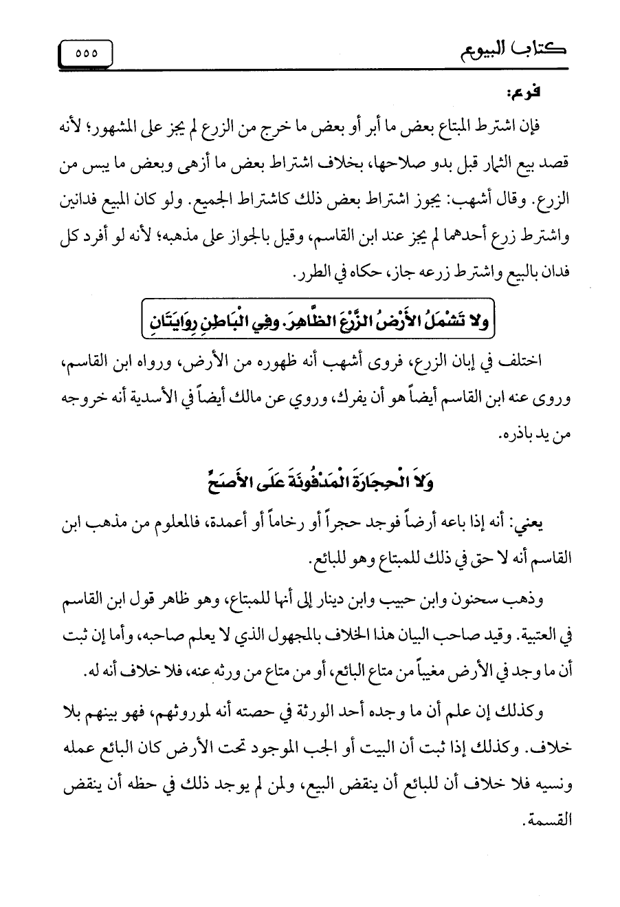 فإن اشترط المبتاع بعض ما أبر أو بعض ما خرج من الزرع لم يجز على المشهور، لأنه قصد بيع الثمار قبل بدو صلاحها، بخلاف اشتراط بعض ما أزهى وبعض ما يبس من الزرع. وقال أشهب: يجوز اشتراط بعض ذلك كاشتراط الجميع. ولو كان المبيع فدانين واشترط زرع أحدهما لم يجز عند ابن القاسم، وقيل بالجواز على مذهبه، لأنه لو أفرد كل فدان بالبيع واشترط زرعه جاز، حكاه في الطرر.