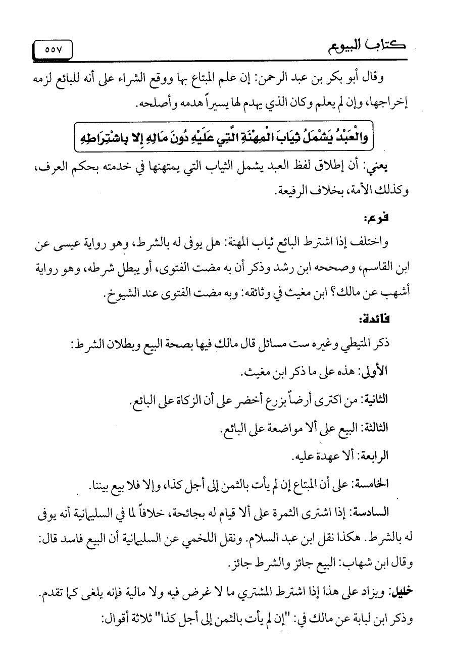 واختلف إذا اشترط البائع ثياب المهنة: هل يوفى له بالشرط، وهو رواية عيسى عن ابن القاسم، وصححه ابن رشد وذكر أن به مضت الفتوى، أو يبطل شرطه، وهو رواية أشهب عن مالك؟ ابن مغيث في وثائقه: وبه مضت الفتوى عند الشيوخ.