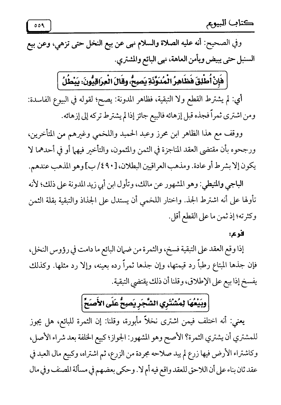 ووقف مع هذا الظاهر ابن محرز وعبد الحميد واللخمي وغيرهم من المتأخرين، ورجحوه بأن مقتضى العقد المناجزة في الثمن والمثمون، والتأخير فيهما أو في أحدهما لا يكون إلا بشرط أو عادة. ومذهب العراقيين البطلان، [490/ب] وهو المذهب عندهم.