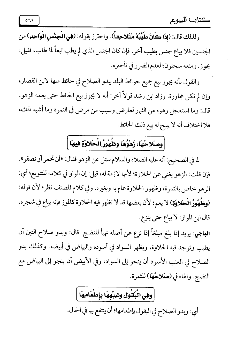 والقول بأنه يجوز بيع جميع حوائط البلد ببدو الصلاح في حائط منها لابن القصار، وإن لم تكن مجاورة. وزاد ابن رشد قولاً آخر: أنه لا يجوز بيع الحائط حتى يعمه الزهو. قال: وما استعجل زهوه من الثمار لعارض وسبب من مرض في الثمرة وما أشبه ذلك، فلا اختلاف أنه لا يبيح له بيع ذلك الحائط.