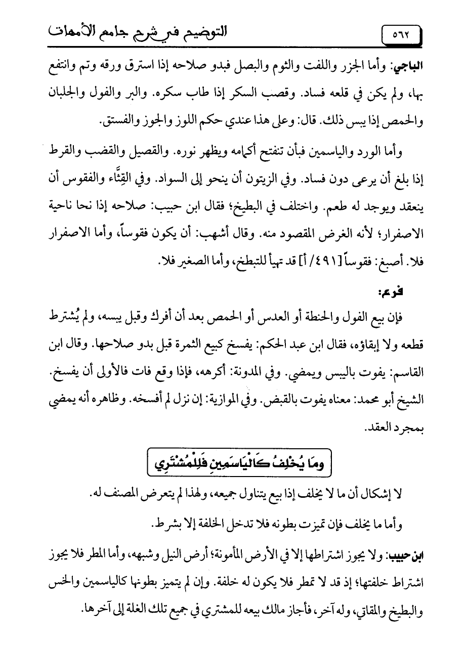 ابن حبيب: ولا يجوز اشتراطها إلا في الأرض المأمونة، أرض النيل وشبهه، وأما المطر فلا يجوز اشتراط خلفتها، إذ قد لا تمطر فلا يكون له خلفة. وإن لم يتميز بطونها كالياسمين والخس والبطيخ والمقاتي، وله آخر، فأجاز مالك بيعه للمشتري في جميع تلك الغلة إلى آخرها.