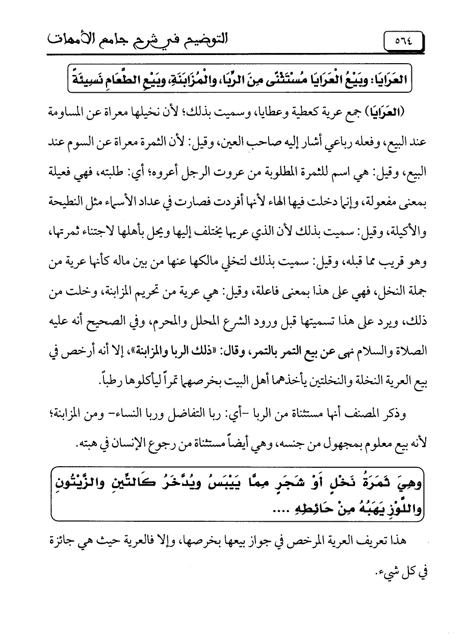 (العرايا) جمع عرية كعطية وعطايا، وسميت بذلك، لأن نخيلها معراة عن المساومة عند البيع، وفعله رباعي أشار غليه صاحب العين، وقيل: لأن الثمرة معراة عن السوم عند البيع، وقيل: هي اسم للثمرة المطلوبة من عروت الرجل أعروه، أي: طلبته، فهي فعيلة بمعنى مفعولة، وإنما دخلت فيها الهاء لأنها أفردت فصارت في عداد الأسماء مثل النطيحة والأكيلة، وقيل: سميت بذلك لأن الذي عريها يختلف إليها ويحل بأهلها لاجتناء ثمرتها، وهو قريب مما قبله، وقيل: سميت بذلك لتخلي مالكها عنها من بين ماله كأنها عرية من جملة النخل، فهي على هذا بمعنى فاعلة، وقيل: هي عرية من تحريم المزابنة، وخلت من ذلك، ويرد على هذا تسميتها قبل ورود الشرع المحلل والمحرم، وفي الصحيح أنه عليه الصلاة والسلام نهى عن يع التمر بالتمر، وقال: ((ذلك الربا والمزابنة))، إلا أنه أرخص في بيع العرية النخلة والنخلتين يأخذهما أهل البيت بخرصهما تمراً ليأكلوها رطباً.