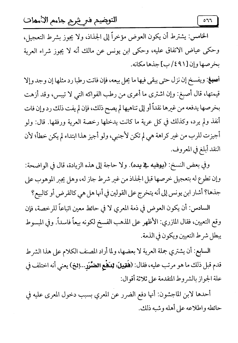 السابع: أن يشتري جملة العرية لا بعضها، ولما أراد المصنف الكلام على هذا الشرط قدم قبل ذلك ما هو مرتب عليه، فقال: (فقيل: لدفع الضرر .... إلخ) يعني أنه اختلف في علة الجواز بالشروط المتقدمة على ثلاثة أقوال: