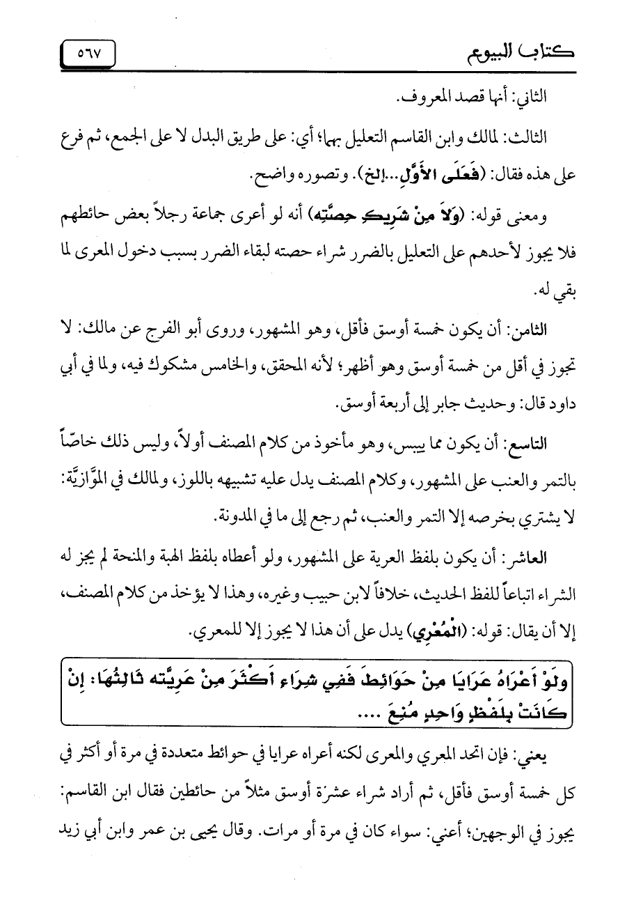 العاشر: أن يكون بلفظ العرية على المشهور، ولو أعطاه بلفظ الهبة والمنحة لم يجز له الشراء اتباعاً للفظ الحديث، خلافاً لابن حبيب وغيره، وهذا لا يؤخذ من كلام المصنف، إلا أن يقال: قوله: (المعري) يدل على أن هذا لا يجوز إلا للمعري.