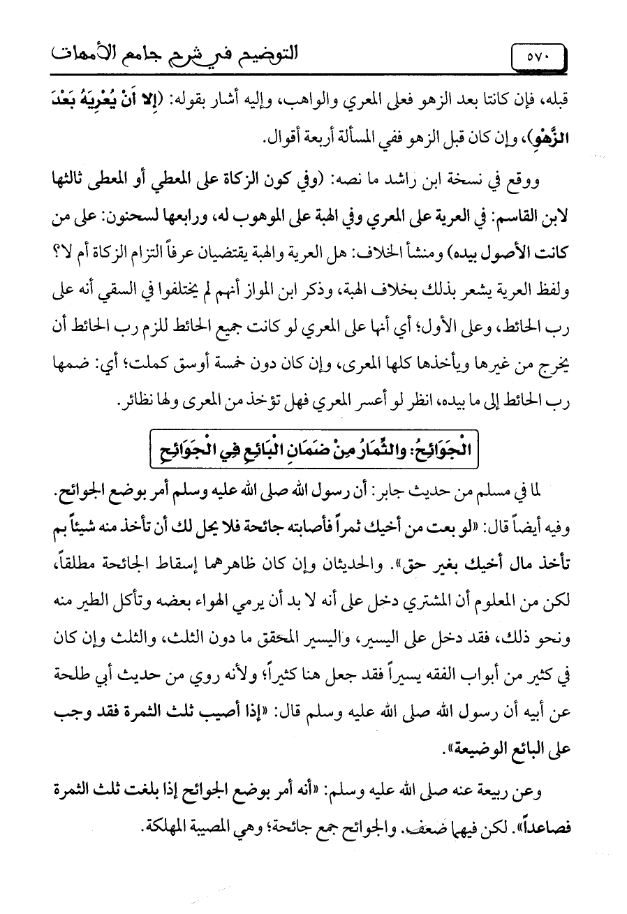 ووقع في نسخة ابن راشد ما نصه: (وفي كون الزكاة على المعطي أو المعطى ثالثها لابن القاسم: في العرية على المعري وفي الهبة على الموهوب له، ورابعها لسحنون: على من كانت الأصول بيده) ومنشأ الخلاف: هل العرية والهبة يقتضيان عرفاً التزام الزكاة أم لا؟ ولفظ العرية يشعر بذلك بخلاف الهبة، وذكر ابن المواز أنهم لم يختلفوا في السقي أنه على رب الحائط، وعلى الأول، أي أنها على المعري لو كانت جميع الحائط للزم رب الحائط أن يخرج من غيرها ويأخذها كلها المعرى، وإن كان دون خمسة أوسق كلمت، أي: ضمها رب الحائط إلى ما بيده، انظر لو أعسر المعري فهل تؤخذ من المعرى ولها نظائر.