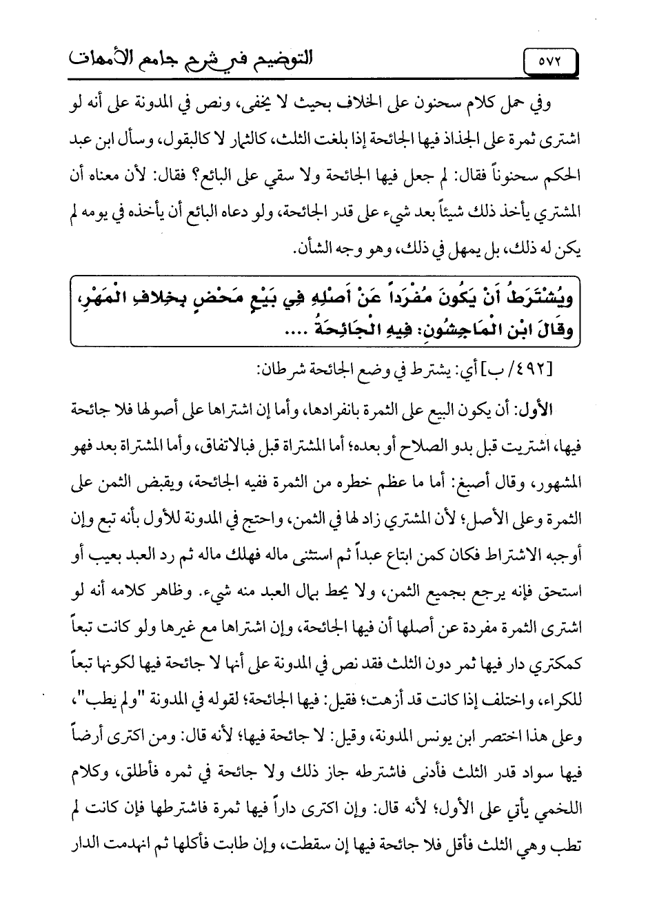 ويشترط أن يكون مفرداً عن أصله في بيع محض بخلاف المهر، وقال ابن الماجشون: فيه الجائحة ....