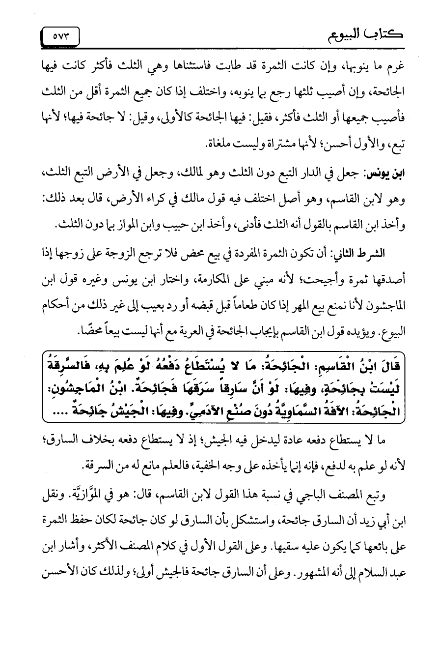 قال ابن القاسم: الجائحة: ما لا يستطاع دفعه لو علم به، فالسرقة ليست بجائحة، وفيها: لو أن سارقاً سرقها فجائحة. ابن الماجشون: الجائحة: الآفة السماوية دون صنع الآدمي. وفيها: الجيش جائحة ....