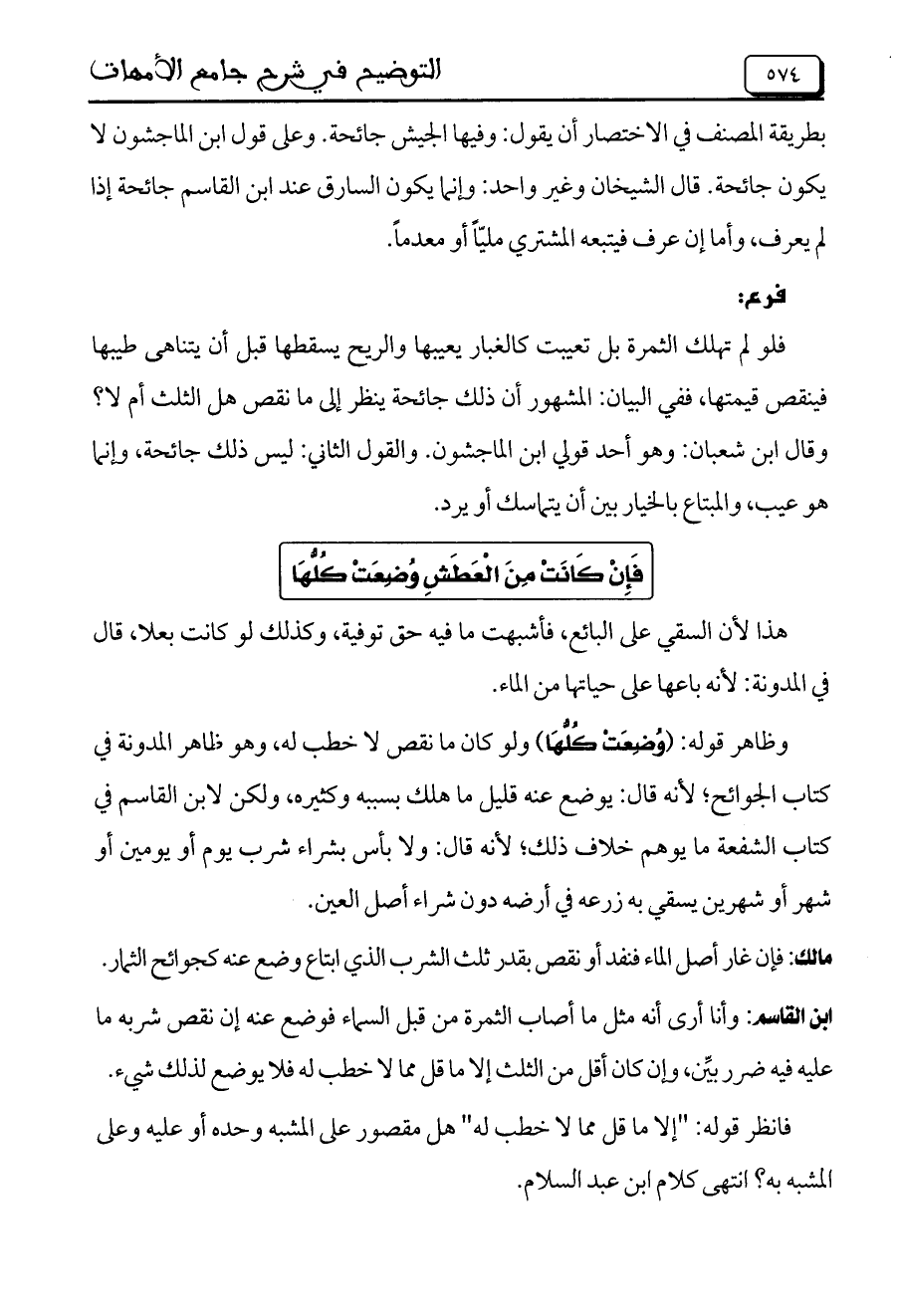وظاهر قوله: (وضعت كلها) ولو كان ما نقص لا خطب له، وهو ظاهر المدونة في كتاب الحوائج، لأنه قال: يوضع عنه قليل ما هلك بسببه وكثيره، ولكن لابن القاسم في كتاب الشفعة ما يوهم خلاف ذلك، لأنه قال: ولا بأس بشراء شرب يوم أو يومين أو شهر أو شهرين يسقي به زرعه في أرضه دون شراء أصل العين.