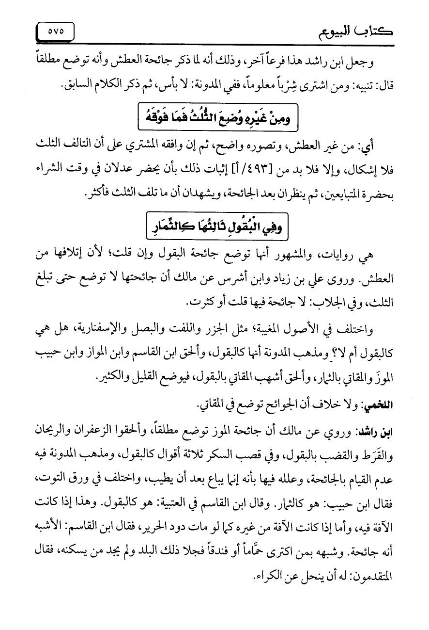 ابن رشد: وروي عن مالك أن جائحة الموز توضع مطلقاً، وألحقوا الزعفران والريحان والقَرَط والقضب بالبقول، وفي قصب السكر ثلاثة أقوال كالبقول، ومذهب المدونة فيه عدم القيام بالجائحة، وعلله فيها بأنه إنما يباع بعد أن يطيب، واختلف في ورق التوت، فقال ابن حبيب: هو كالثمار. وقال ابن القاسم في العتبية: هو كالبقول. وهذا إذا كانت الآفة فيه، وأما إذا كانت الآفة من غيره كما لو مات دود الحرير، فقال ابن القاسم: الأشبه أنه جائحة. وشبهه بمن اكترى حَّماماً أو فندقاً فجلا ذلك البلد ولم يجد من يسكنه، فقال المتقدمون: له أن ينحل عن الكراء.
