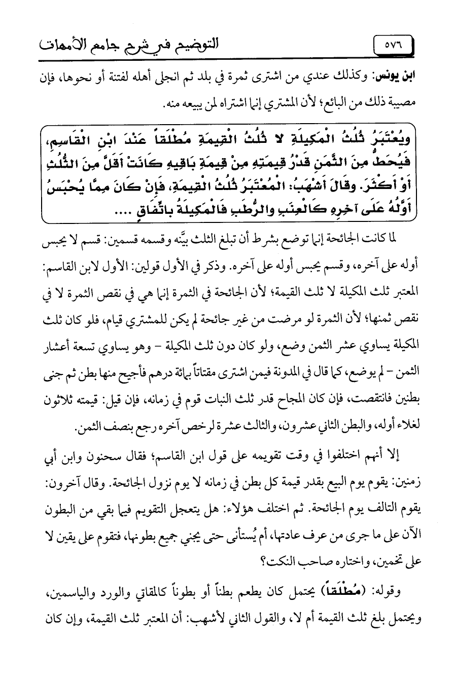 ويعتبر ثلث المكيلة لا ثلث القيمة مطلقاً عند ابن القاسم، فيحط من الثمن قدر قيمته من قيمة باقيه كانت أقل من الثلث أو أكثر. وقال أشهب: المعتبر ثلث القيمة، فإن كان مما يحبس أوله على آخره كالعنب والرطب فالمكيلة باتفاق ....