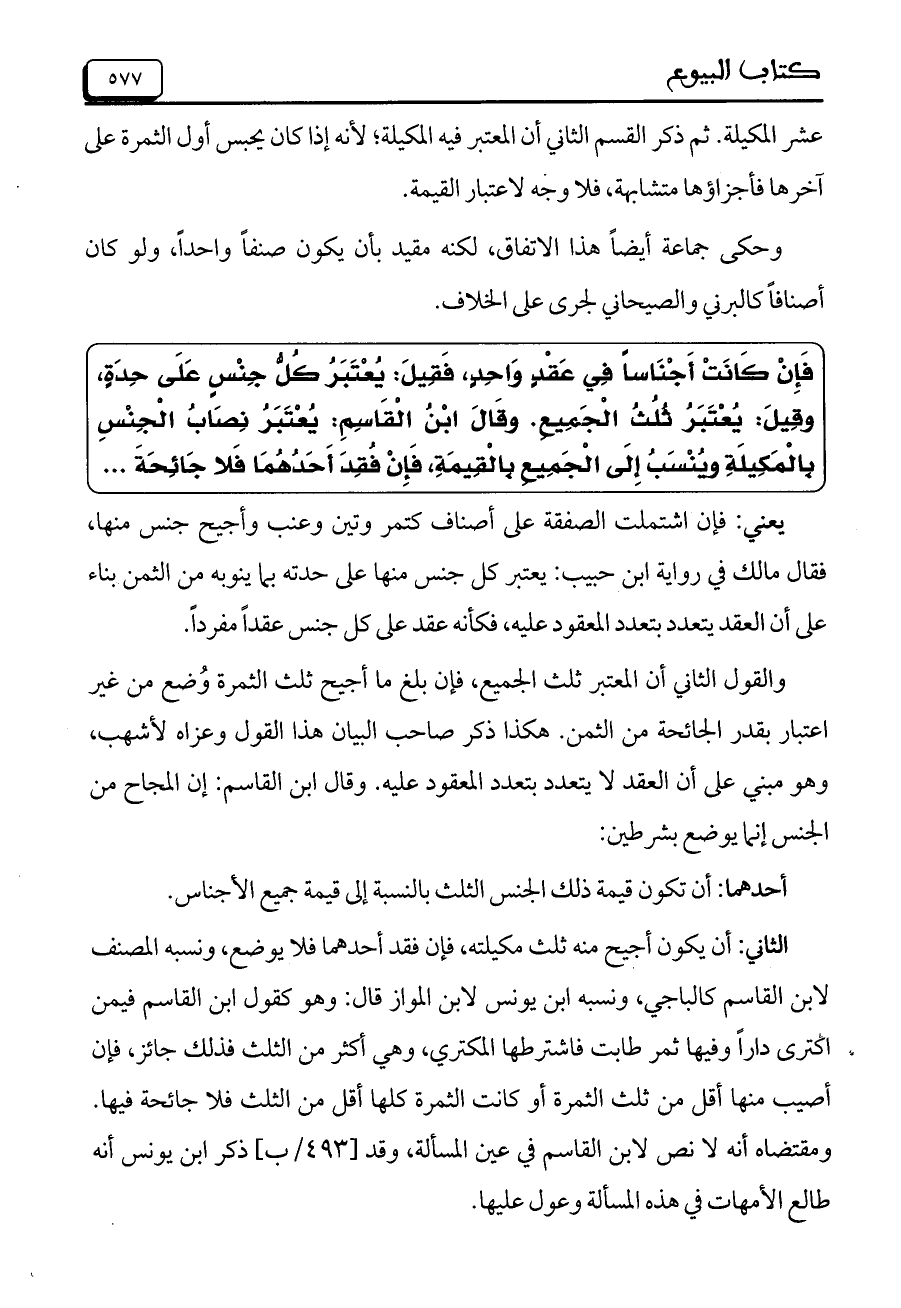 فإن كانت أجناساً في عقد واحد، فقيل: يعتبر كل جنس على حدة، وقيل: يعتبر ثلث الجميع. وقال ابن القاسم: يعتبر نصاب الجنس بالمكيلة وينسب إلى الجميع بالقيمة فإن فقد أحدهما فلا جائحة ....