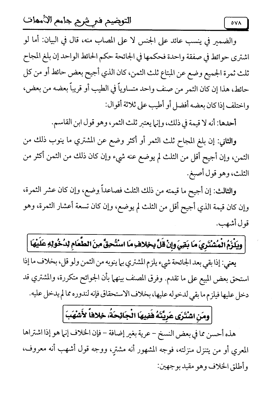 والضمير في ينسب عائد على الجنس لا على المصاب منه، قال في البيان: أما لو اشترى حوائط في صفقة واحد فحكمها في الجائحة حكم الحائط الواحد إن بلغ المجاح ثلث ثمرة الجميع وضع عن المبتاع ثلث الثمن، كان الذي أجيح بعض حائط أو من كل حائط، هذا إن كان الثمر من صنف واحد متساوياً في الطيب أو قريباً بعضه من بعض، واختلف إذا كان بعضه أفضل أو أطيب على ثلاثة أقوال: