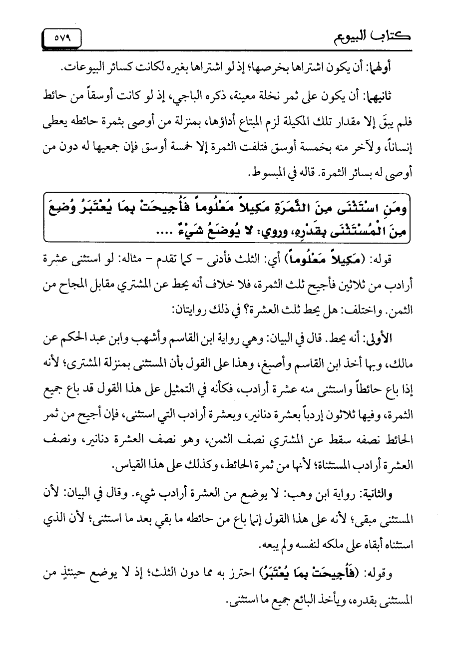 والثانية: رواية ابن وهب: لا يوضع من العشرة أرادب شيء. وقال في البيان: لأن المستثنى مبقى، لأنه على هذا القول إنما باع من حائطه ما بقي بعد ما استثنى، لأن الذي استثناه أبقاه على ملكه لنفسه ولم يبعه.