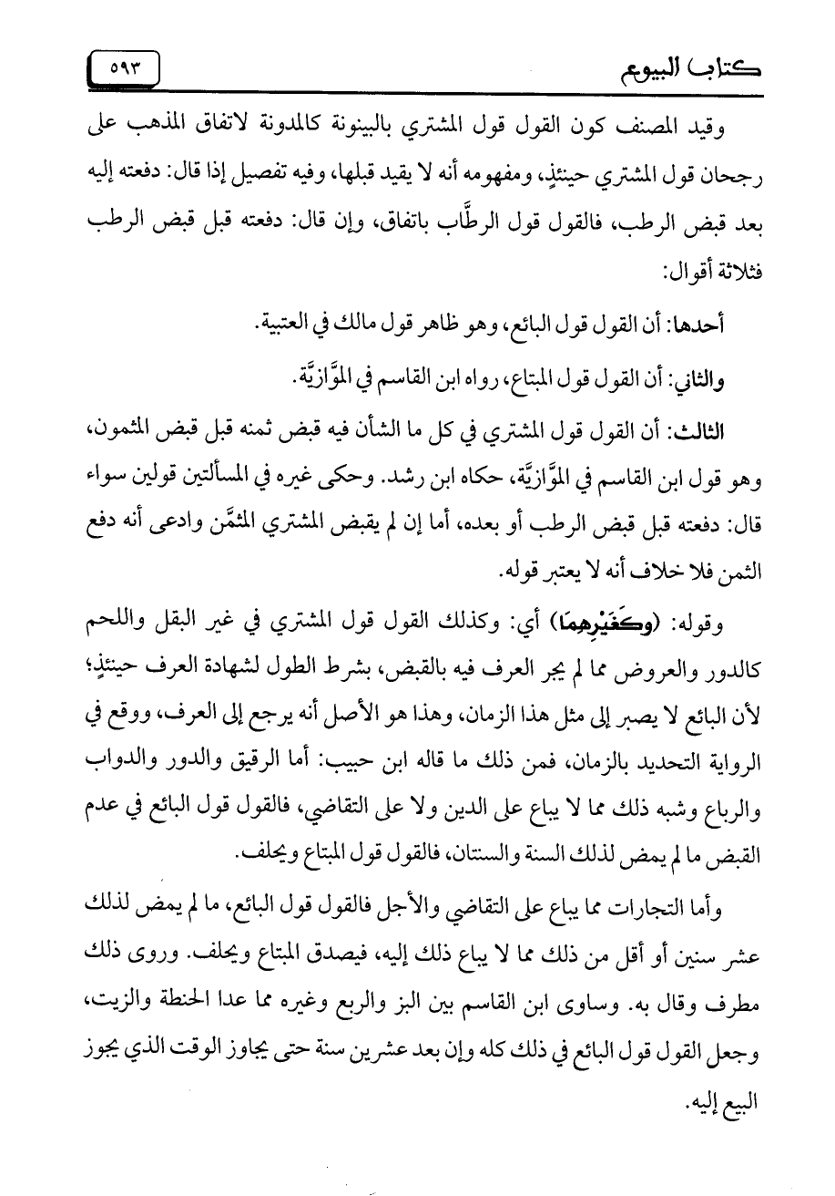 الثالث: أن القول قول المشتري في كل ما الشأن فيه قبض ثمنه قبل قبض المثمون، وهو قول ابن القاسم في الموَّازيَّة، حكاه ابن رشد. وحكى غيره في المسألتين قولين سواء قال: دفعته قبل قبض الرطب أو بعده، أما إن لم يقبض المشتري المثمَّن وادعى أنه دفع الثمن فلا خلاف أنه لا يعتبر قوله: