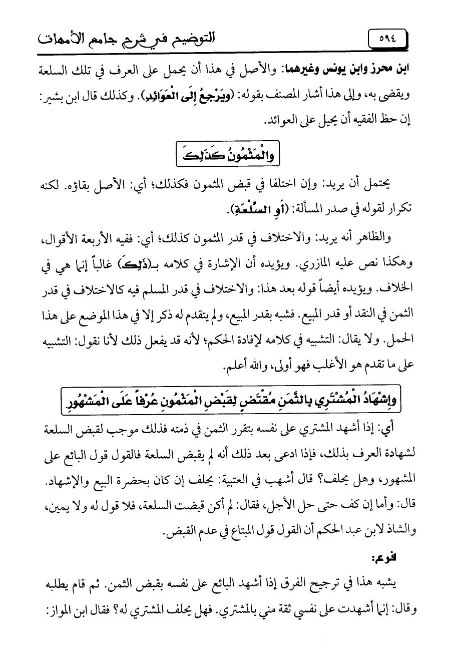 والظاهر أنه يريد: والاختلاف في قدر المثمون كذلك، أي: ففيه الأربعة الأقوال، وهكذا نص عليه المازري. ويؤيده أن الإشارة في كلامه بـ (ذلك) غالباً إنما هي في الخلاف. ويؤيده أيضاً قوله بعد هذا: والاختلاف في قدر المسلم فيه كالاختلاف في قدر الثمن في النقد أو قدر المبيع. فشبه بقدر المبيع، ولم يتقدم له ذكر إلا في هذا الموضوع على هذا الحمل. ولا يقال: التشبيه في كلامه لإفادة الحكم، لأنه قد يفعل ذلك لأنا نقول: التشبيه على ما تقدم هو الأغلب فهو أولى، والله أعلم.
