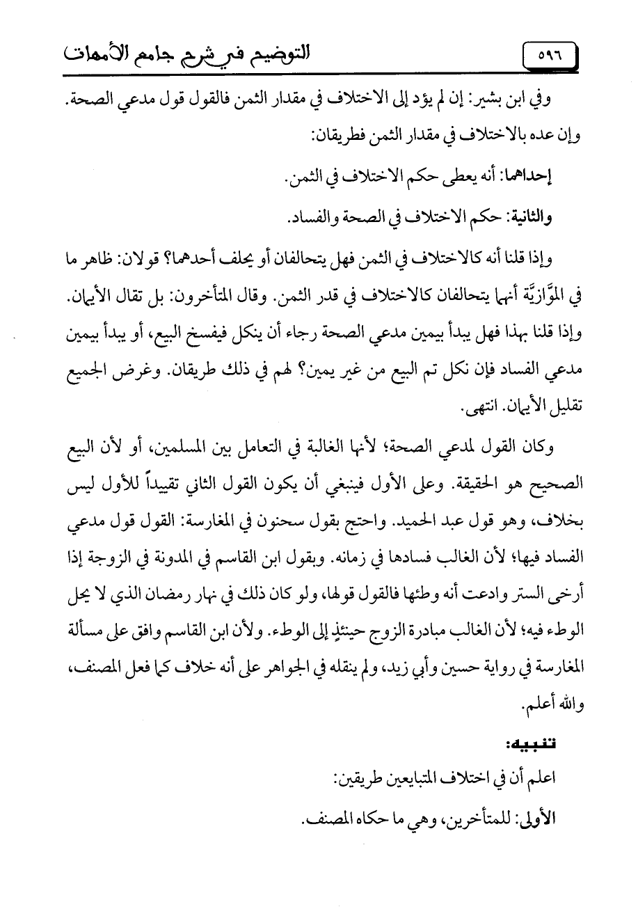 وكان القول لمدعي الصحة، لأنها الغالبة في التعامل بين المسلمين، أو لأن البيع الصحيح هو الحقيقة. وعلى الأول فينبغي أن يكون القول الثاني تقييداً للأول ليس بخلاف، وهو قول عبد الحميد. واحتج بقول سحنون في المغارسة: القول قول مدعي الفساد فيها، لأن الغالب فسادها في زمانه. وبقول ابن القاسم في المدونة في الزوجة إذا أرخى الستر وادعت أنه وطئها فالقول قولها، ولو كان ذلك في نهار رمضان الذي لا يحل الوطء فيه، لأن الغالب مبادرة الزوج حينئذٍ إلى الوطء. ولأن ابن القاسم وافق على مسألة المغارسة في رواية حسين وأبي زيد، ولم ينقله في الجواهر على أنه خلاف كما فعل المصنف، والله أعلم.