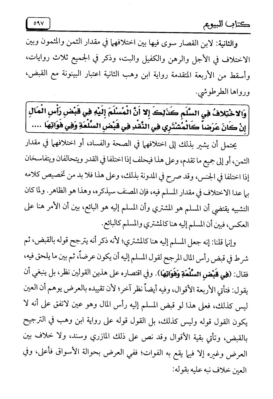 وإنما قلنا: إنه جعل المسلم إليه هنا كالمشتري، لأنه ذكر أنه يترجح قوله بالقبض، ثم شرط في قبض رأس المال المرجح لقول المسلم إليه أن يكون عرضاً، ثم بين ما يلحق فيه، فقال: (في قبض السلعة وفواتها). وفي اقتصاره على هذين القولين نظر، بل ينبغي أن يقول: فتأتي الأربعة الأقوال، وفيه أيضاً نظر آخر، لأن تقييده بالعرض يوهم أن العين ليس كذلك، فعلى هذا لو قبض المسلم إليه رأس المال وهو عين لاتفق على أنه لا يكون القول قوله وليس كذلك، بل القول قوله على رواية ابن وهب في الترجيح بالقبض، وتأتي بقية الأقوال وقد نص على ذلك المازري وسند، ولا خلاف بين العرض وغيره إلا فيما يقع به الفوات، ففي العرض بحوالة الأسواق فأعلى، وفي العين خلاف نبه عليه بقوله: