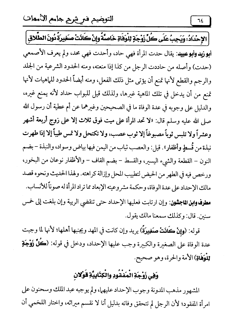 أبو زيد وأبو عبيد: يقال حدث المرأة فهي حاد، وأحدث فهي محد، ولم يعرف الأصمعي (حدت) وأصله من حاددت الرجل من كذا إذا منعته، ومنه الحدود الشرعية من الجلد والرجم والقطع لأنه تمنع أن يؤتى مثل ذلك الفعل، ومنه أيضاً الحدود للماهيات لأنها تمنع من أن يدخل في تلك الماهية غيرها، ولذلك قيل للبواب حداد لأنه يمنع غيره، والدليل على وجوبه في عدة الوفاة ما في الصحيحين وغيرهم عن أم عطية أن رسول الله صلى الله عليه وسلم قال: ((لا تحد المرأة على ميت فوق ثلاث إلا على زوج أربعة أشهر ولا تلبس ثوباً مصبوغاً إلا ثوب عصب، ولا تكتحل ولا تمس طيباً إلا إذا طهرت نبذة من قُسطٍ وأظفار)). قيل: والعصب ثيا من اليمن فيها بياض وسواد، والنبذة- بضم النون- القطعة والشيء اليسير، والقسط- بضم القاف- والأظفار نوعان من البخور، ورخص فيه في الطهر من الحيض لتطييب المحل وإزالة كراهته. ولهذا الحديث ونحوه قصد مالك الإحداد على عدة الوفاة، وحكمة مشروعيته الإبعاد مما تراه المرأة له صوناً للأنساب.