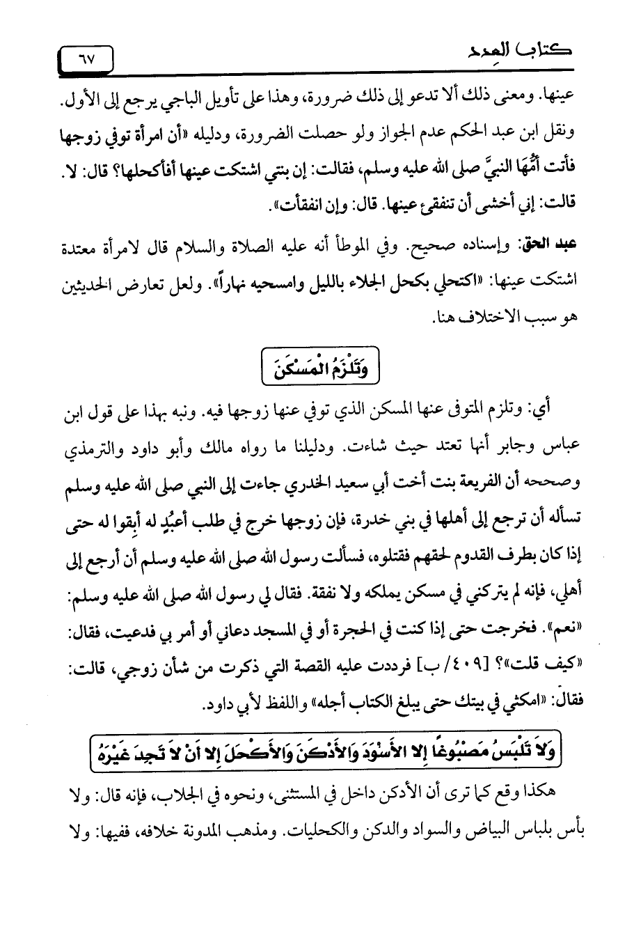 عبد الحق: وإسناده صحيح. وفي الموطأ أنه عليه الصلاة والسلام قال لامرأة معتدة اشتكت عينها: ((اكتحلي بكحل الجلاء بالليل وامسحيه نهاراً)). ولعل تعارض الحديثين هو سبب الاختلاف هنا.