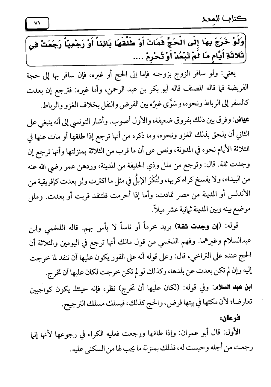عياض: وفرق بين ذلك بفروق ضعيفة، والأول أصوب. وأشار التونسي إلى أنه ينبغي على الثاني أن يلحق بذلك الغزو ونحوه، وما ذكره من أنها ترجع إذا طلقها أو مات عنها في الثلاثة الأيام نحوه في المدونة، ونص على أن ما قرب من الثلاثة بمنزلتها وأنها ترجع إن وجدت ثقة. قال: وترجع من ملل وذوي الحليفة من المدينة، وردهن عمر رضي الله عنه من البيداء، ولا يفسخ كراء كريها، ولتكر الإبل فيمثل ما اكترت ولو بعدت كإفريقية من الأندلس أو المدينة من مصر تمادت، وأما إذا أحرمت فلتنفد قربت أو بعدت. وملل موضع بينه وبين المدينة ثمانية عشر ميلاً.