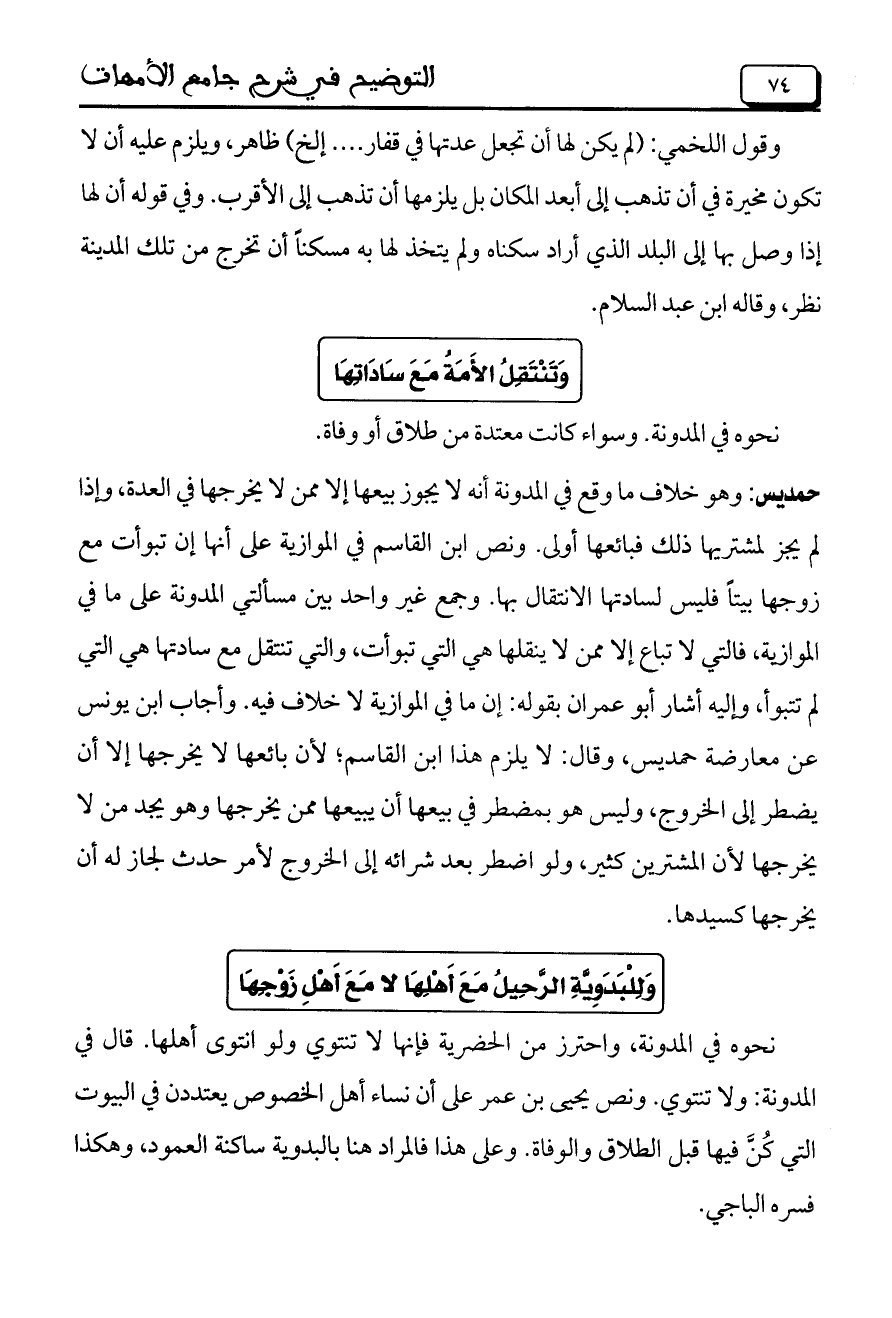 حمديس: وهو خلاف ما وقع في المدونة أنه لا يجوز بيعها إلا ممن لا يخرجها في العدة، وإذا لم يجز لمشتريها ذلك فبائعها أولى. ونص ابن القاسم في الموازية على أنها إن تبوأت مع زوجاً بيتاً فليس لسادتها الانتقال بها. وجمع غير واحد بين مسألتي المدونة على ما في الموازية، فالتي لا تباع إلا ممن لا ينقلها هي التي تبوأت، والتي تنتقل مع سادتها هي التي لم تتبوأ، وإليه أشار أبو عمران بقوله: إن ما في الموازنة لا خلاف فيه. وأجاب ابن يونس عن معارضة حمديس، وقال: لا يلزم هذا ابن القاسم، لأن بائعها لا يخرجها إلا أن يضطر إلى الخروج، وليس هو بمضطر في بيعها أن يبيعها ممن يخرجها وهو يجد من لا يخرجها لأن المشترين كثير، ولو اضطر بعد شرائه إلى الخروج لأمر حدث لجاز له أن يخرجها كسيدها.