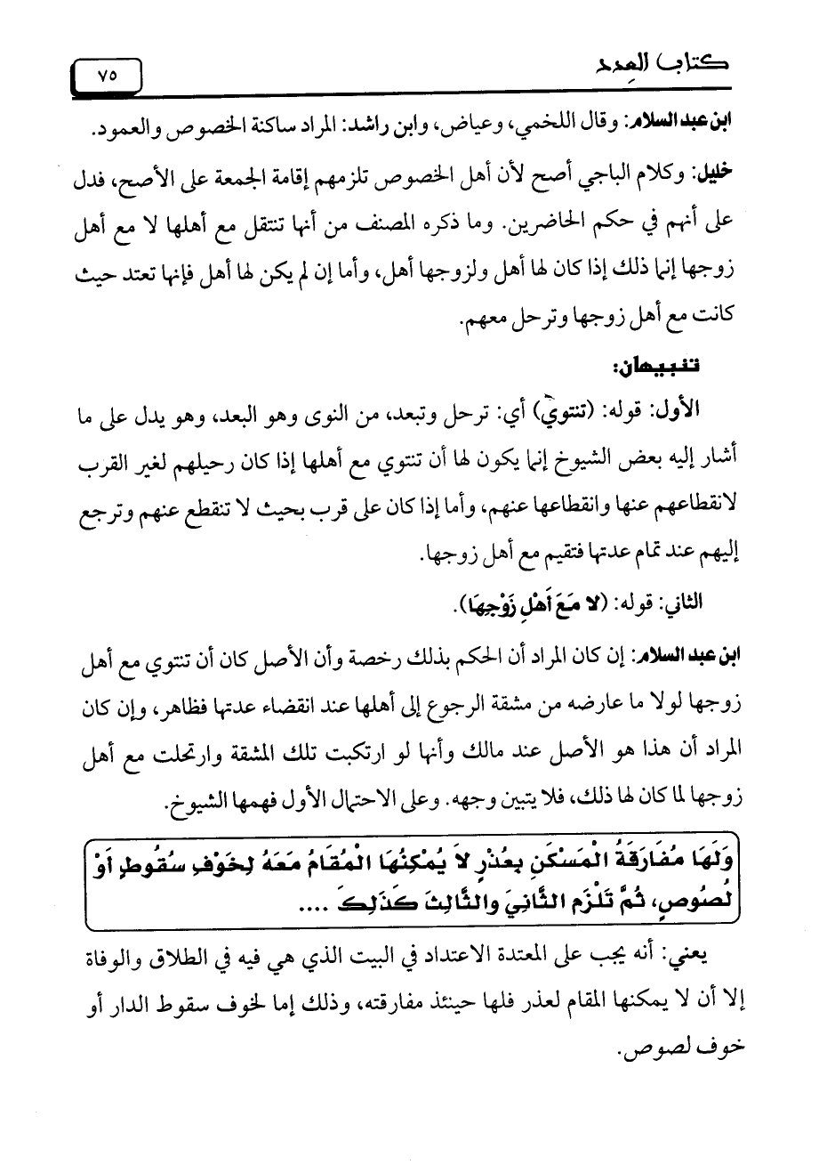 ابن عبد السلام: إن كان المراد أن الحكم بذلك رخصة وأن الأصل كان أن تنتوي مع أهل زوجها لولا مع عارضه من مشقة الرجوع إلى أهلها عند انقضاء عدتها فظاهر، وإن كان المراد أن هذا هو الأصل عند مالك وأنها لو ارتكبت تلك المشقة وارتحلت مع أهل زوجها لما كان لها ذلك، فلا يتبين وجهه. وعلى الاحتمال الأول فهمها الشيوخ.