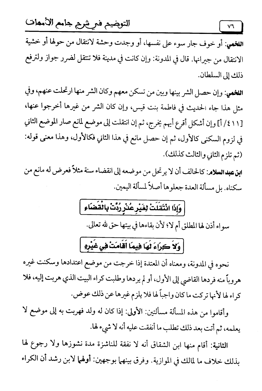 اللخمي: وإن حصل الشرك بينها وبين من تسكن معهم وكان الشر منها ارتحلت عنهم، وفي مثل هذا جاء الحديث في فاطمة بيت قيس، وإن كان الشر من غيرها أخرجوا عنها، [411/أ] وإن أشكل أقرع أيهم يخرج، ثم إن انتقلت إلى موضع لمانع صار الموضع الثاني في لزوم السكنى كالأول، ثم إن حصل مانع في هذا الثاني كالأول، وهذا معنى قوله: (ثم تلزم الثاني والثالث كذلك).