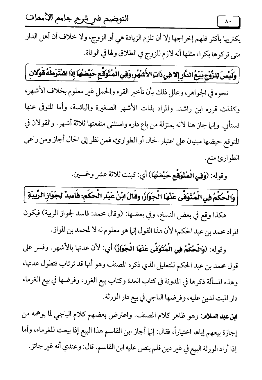 وقوله: (وَالْحُكْمُ فِي الْمُتَوَفَّى عَنْهَا الْجوَازٌ) أي: لأن عدتها بالأشهر. وفسر على قول محمد بن عبد الحكم للتعليل الذي ذكره المصنف وهو أنها قد ترتاب فتطول عدتها، وهذه المسألة ذكرها في المدونة في كتاب العدة وكتاب بيع الغرر، وفرضها في بيع الغرماء دار الميت لدين عليه، وفرضها الباجي في بيع دار الورثة.
