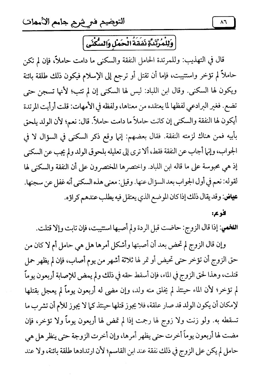 وإن قال الزوج لم تحض بعد أن أصبتها وأشكل أمرها هل هي حامل أم لا كان من حق الزوج أن تؤخر حتى تحيض أو تمر لها ثلاثة أشهر من يوم أصاب، فإن لم يظهر حمل قتلت، وهذا لحق الزوج في الماء، فإن أسقط حقه في ذلك ولم يمض للإصابة أربعون يوماً لم تؤخر، لأن الماء حينئذ لم يخلق منه ولد، وإن مضى له أربعون يوماً لم يعجل بقتلها لإمكان أن يكون الولد قد صار علقة، فلا يجوز قتلها حينئذ كما لا يجوز للأم أن تشرب ما تسقطه به. ولو زنت ولا زوج لها رجمت إذا لم تمض لها أربعون يوماً ولا تؤخر، فإن مضت لها أربعون يوماً أخرت حتى يظهر أمرها، وإن أخرت الزوجة حتى ينظر هل هي حامل لم يكن على الزوج في ذلك نفقة عند ابن القاسم، لأن ارتدادها طلقة بائنة، ولا عند