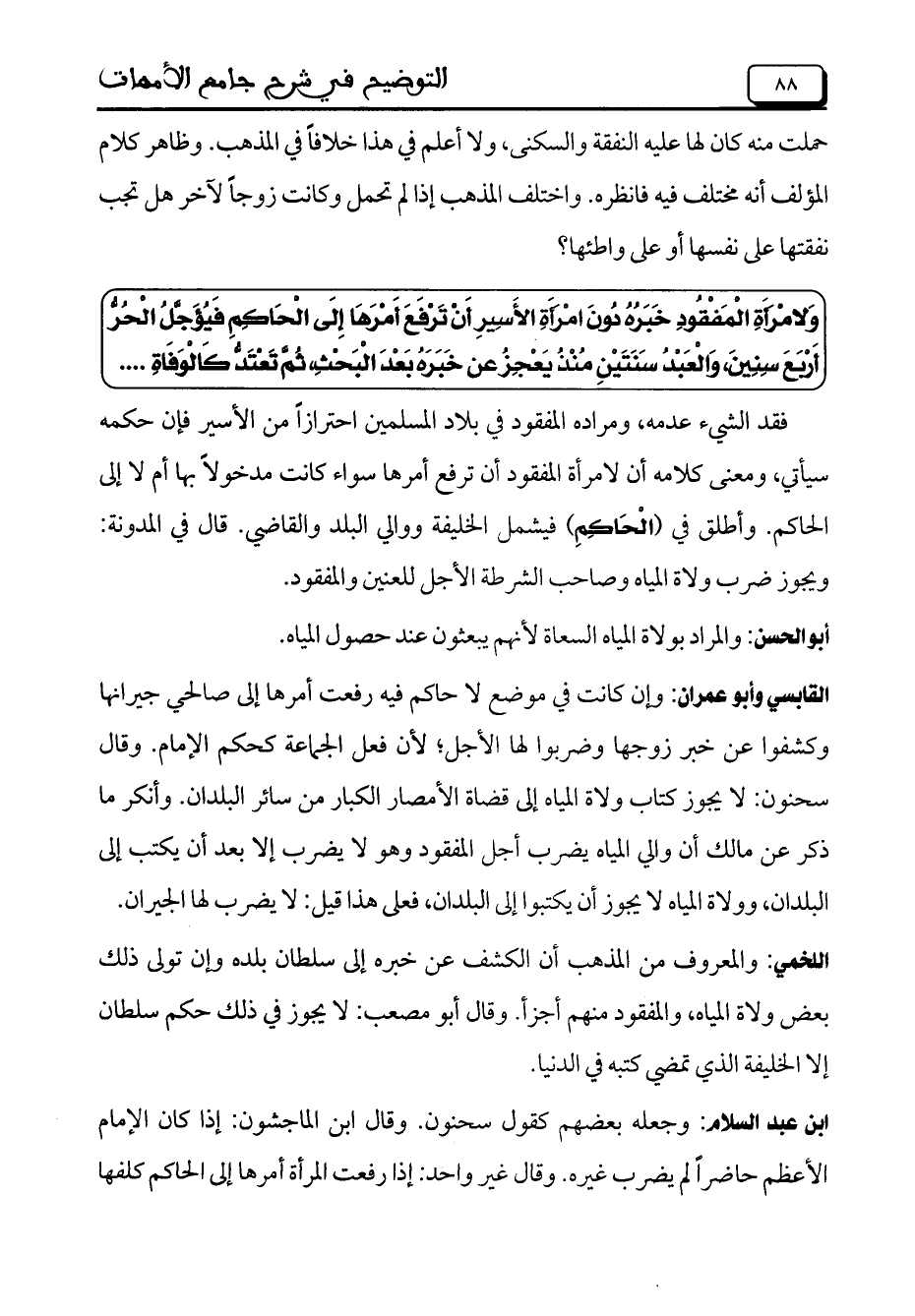 وَلامْرَأَةِ الْمَفْقُودِ خَبَرُهُ دُونَ امْرَأَةِ الأَسِيرِ أَنْ تَرْفَعَ أَمْرَهَا إِلَى الْحَاكِمِ فَيُؤَجَّلُ الْحُرُّ أَرْبَعَ سِنِينَ، وَالْعَبْدُ سَنَتَيْنِ مُنْذُ يَعْجِزُ عن خَبَرَهُ بَعْدَ الْبَحْثِ، ثُمَّ تَعْتَدُّ كَالْوَفَاَةِ ....