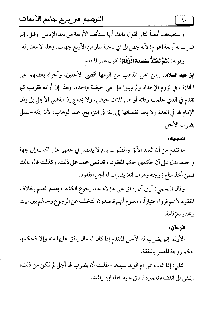 ابن عبد السلام: ومن أهل المذهب من ألزمها أقصى الأجلين، وأجراه بعضهم على الخلاف في لزوم الإحداد ولم يبينوا هل هي حيضة واحدة. وهذا إن أراده فقريب كما تقدم في الذي علمت وفاته أو هي ثلاث حيض، ولا يحتاج إذا انقضى الأجل إلى إذن الإمام لها في العدة ولا بعد انقضائها إلى إذنه في التزويج. عبد الوهاب: لأن إذنه حصل بضرب الأجل.