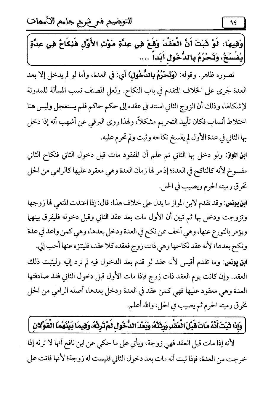 ابن يونس: وما تقدم أقيس لأنه عقد لو قدم بعد الدخول فيه لم ترد إليه وليثبت ذلك العقد. وإن كانت يوم العقد ذات زوج فإذا مات الأول قبل دخول الثاني فقد صادفتها العدة وهي معقود عليها فهي كمن عقد في العدة ودخل بعدها، أصله الرامي من الحل تخرق رميته الحرم ثم يصيب في الحل، والله أعلم.