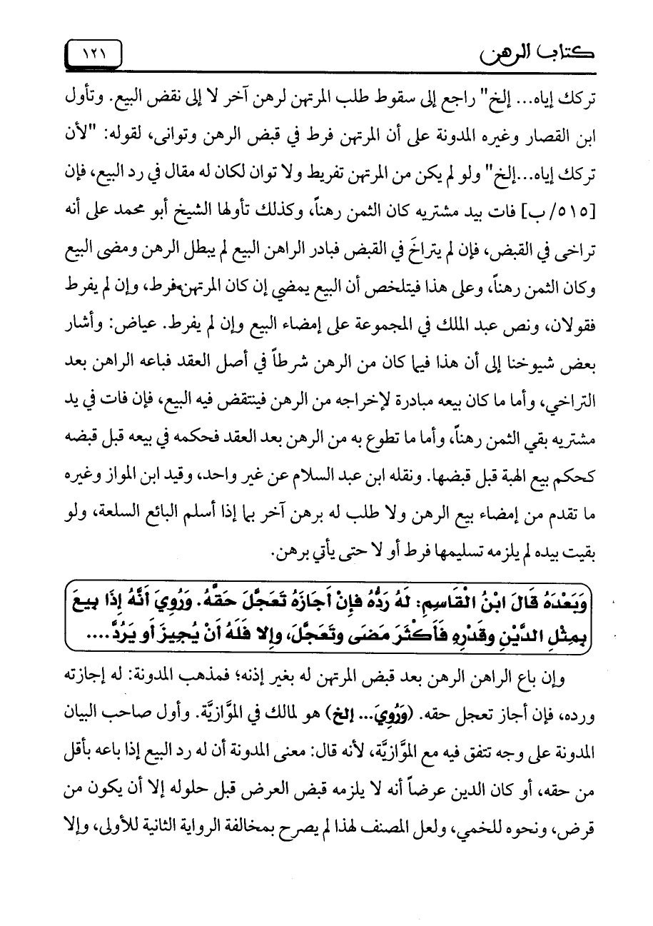 وإن باع الراهن الرهن بعد قبض المرتهن له بغير إذنه؛ فمذهب المدونة: له إجازته ورده، فإن أجاز تعجل حقه. (وَرُوِيَ ... إلخ) هو لمالك في الموَّازيَّة. وأول صاحب البيان المدونة على وجه تتفق فيه مع الموَّازيَّة، لأنه قال: معنى المدونة أن له رد البيع إذا باعه بأقل من حقه، أو كان الدين عرضاً أنه لا يلزمه قبض العرض قبل حلوله إلا أن يكون من قرض، ونحوه للخمي، ولعل المصنف لهذا لم يصرح بمخالفة الرواية الثانية للأولى، وإلا