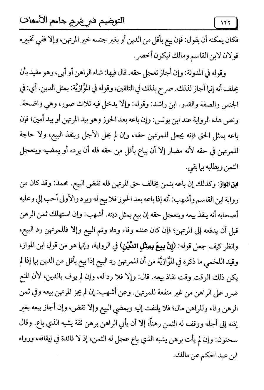 ابن المواز: وكذلك إن باعه بثمن يخالف حق المرتهن فله نقض البيع. محمد: وقد كان من رواية ابن القاسم وأشهب: أنه إذا باعه بعد الحوز فلا بيع له ويرد والأولى أحب إلي وعليه أصحابه أنه ينفذ بيعه ويتعجل حقه إن بيع بمثل دينه. أشهب: وإن استهلك ثمن الرهن قبل أن يدفعه إلى المرتهن؛ فإن كان عنده وفاء وداه وتم البيع وإلا فللمرتهن رد البيع، وانظر كيف جعل قوله: (إِنْ بِيعَ بِمِثْلِ الدَّيْنِ) في الرواية، وإنما هو من قول ابن المواز، وقيد اللخمي ما ذكره في الموَّازيَّة من أن للمرتهن رد البيع إذا بيع بأقل من الدين بما إذا لم يكن ذلك الوقت وقت نفاذ بيعه. قال: وإلا فلا رد له، وإن لم يوف بالدين، لأن المنع ضرر على الراهن من غير منفعة للمرتهن. وعن أشهب: إن لم يجز المرتهن بيعه وفي ثمن الرهن وفاء وللراهن مال؛ فلا يلتفت إليه ويمضي البيع وإلا نقض، وإن أجاز بيعه بغير إذنه إلى أجله ووقف له الثمن رهناً، إلا أن يأتي الراهن برهن ثقة يشبه الذي باع. وقال سحنون: وإن لم يأت برهن يشبه الذي باع عجل له الثمن، إذ لا فائدة في إيقافه، ورواه ابن عبد الحكم عن مالك.