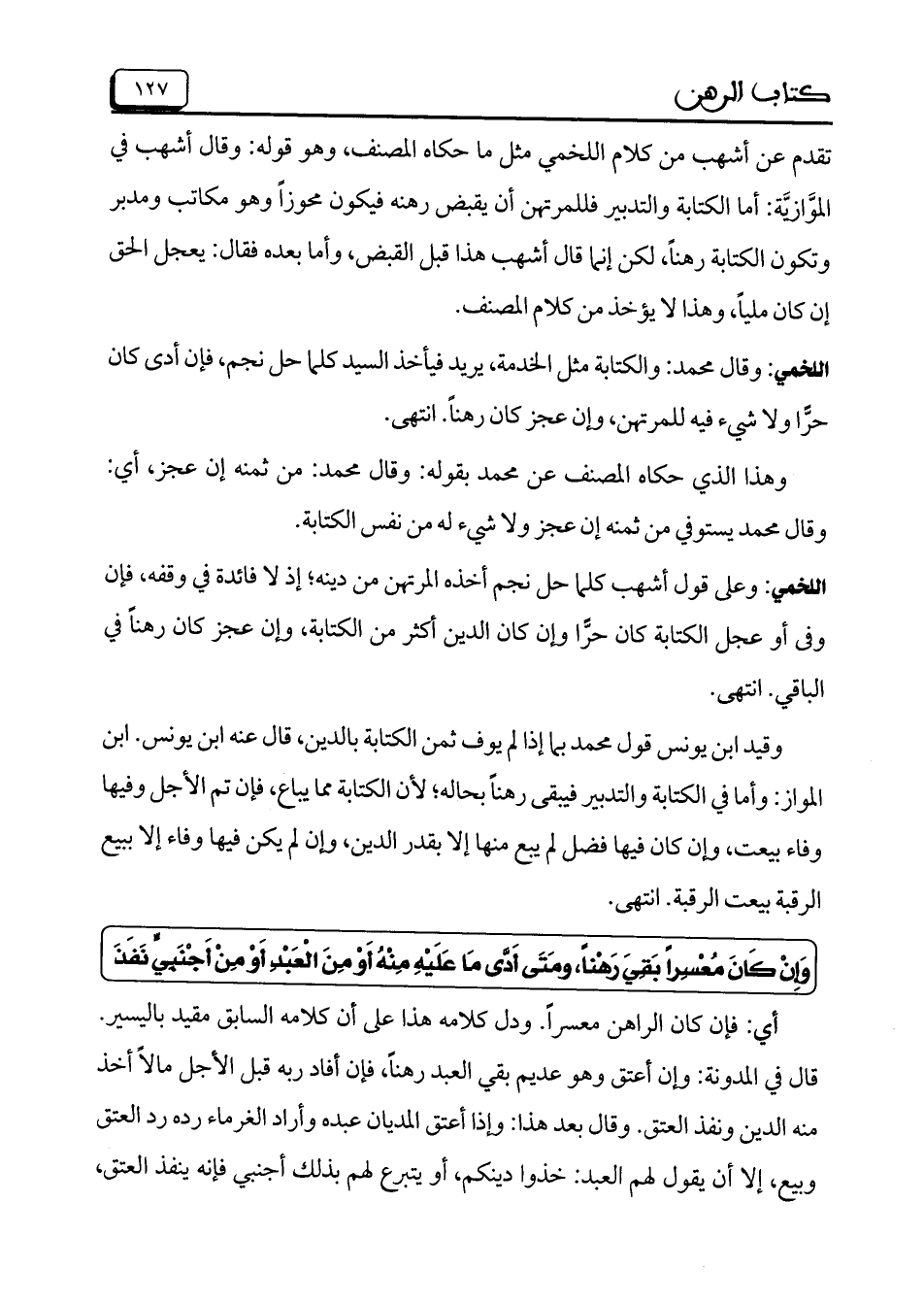 اللخمي: وعلى قول أشهب كلما حل نجم أخذه المرتهن من دينه؛ إذ لا فائدة في وقفه، فإن وفى أو عجل الكتابة كان حراً وإن كان الدين أكثر من الكتابة، وإن عجز كان رهناً في الباقي. انتهى.
