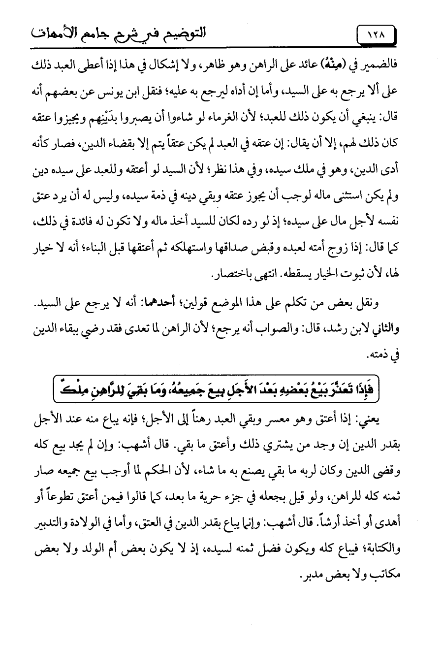 يعني: إذا أعتق وهو معسر وبقي العبد رهناً إلى الأجل؛ فإنه يباع منه عند الأجل بقدر الدين إن وجد من يشتري ذلك وأعتق ما بقي. قال أشهب: وإن لم يجد بيع كله وقضى الدين وكان لربه ما بقي يصنع به ما يشاء، لأن الحكم لما أوجب بيع جميعه صار ثمنه كله للراهن، ولو قيل بجعله في جزء حرية ما بعد، كما قالوا فيمن أعتق تطوعاً أو أهدى أو أخذ أرشاً. قال أشهب: وإنما يباع بقدر الدين في العتق، وأما في الولادة والتدبير والكتابة؛ فيباع كله ويكون فضل ثمنه لسيده، إذ لا يكون بعض أم الولد ولا بعض مكاتب ولا بعض مدبر.