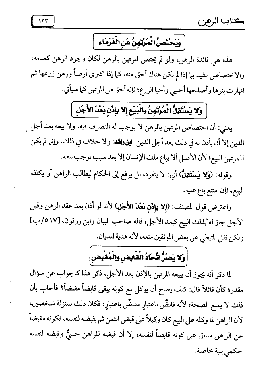 يعني: أن اختصاص المرتهن بالرهن لا يوجب له التصرف فيه، ولا بيعه بعد أجل الدين إلا أن يأذن له في ذلك بعد أجل الدين. ابن راشد: ولا خلاف في ذلك، وإنما لم يكن للمرتهن البيع؛ لأن الأصل ألا يباع ملك الإنسان إلا بعد سبب يوجب بيعه.