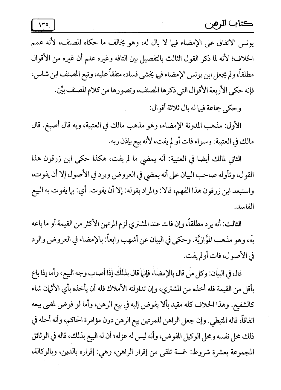 قال في البيان: وكل من قال بالإمضاء فإنما قال بذلك إذا أصاب وجه البيع، وأما إذا باع بأقل من القيمة فله أخذه من المشتري، وإن تداولته الأملاك فله أن يأخذه بأي الأثمان شاء كالشفيع. وهذا الخلاف كله مقيد بألا يفوض إليه في بيع الرهن، وأما لو فوض لمضى بيعه اتفاقاً، قاله المتيطي. وإن جعل الراهن للمرتهن بيع الرهن دون مؤامرة الحاكم، وأنه أحله في ذلك محل نفسه ومحل الوكيل المفوض، وأنه ليس له عزله؛ أن له البيع بذلك، قاله في الوثائق المجموعة بعشرة شروط: خمسة تلقى من إقرار الراهن، وهي: إقراره بالدين، وبالوكالة،
