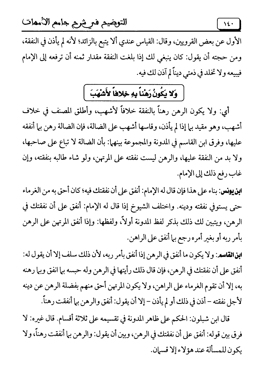 قال ابن شبلون: الحكم على ظاهر المدونة في تقسيمه على ثلاثة أقسام. قال غيره: لا فرق بين قوله: أنفق على أن نفقتك في الرهن، وبين أن يقول: والرهن بما أنفقت رهناً، ولا يكون للمسألة عند هؤلاء إلا قسمان.
