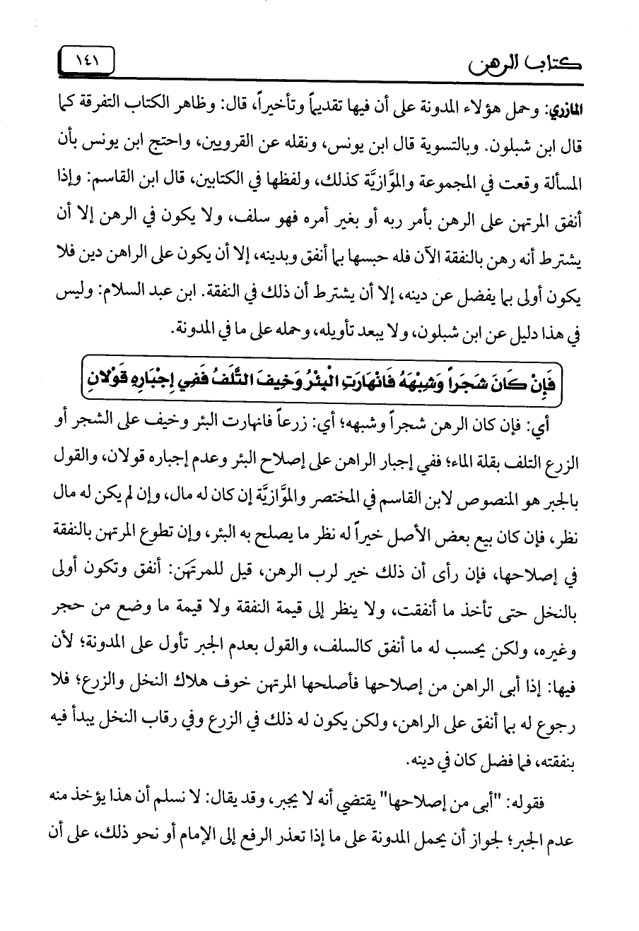 المازري: وحمل هؤلاء المدونة على أن فيها تقديماً وتأخيراً، قال: وظاهر الكتاب التفرقة كما قال ابن شبلون. وبالتسوية قال ابن يونس، ونقله عن القرويين، واحتج ابن يونس بأن المسألة وقعت في المجموعة والموَّازيَّة كذلك، ولفظها في الكتابين، قال ابن القاسم: وإذا أنفق المرتهن على الرهن بأمر ربه أو بغير أمره فهو سلف، ولا يكون في الرهن إلا أن يشترط أنه رهن بالنفقة الآن فله حبسها بما أنفق وبدينه، إلا أن يكون على الراهن دين فلا يكون أولى بما يفضل عن دينه، إلا أن يشترط أن ذلك في النفقة. ابن عبد السلام: وليس في هذا دليل عن ابن شبلون، ولا يبعد تأويله، وحمله على ما في المدونة.