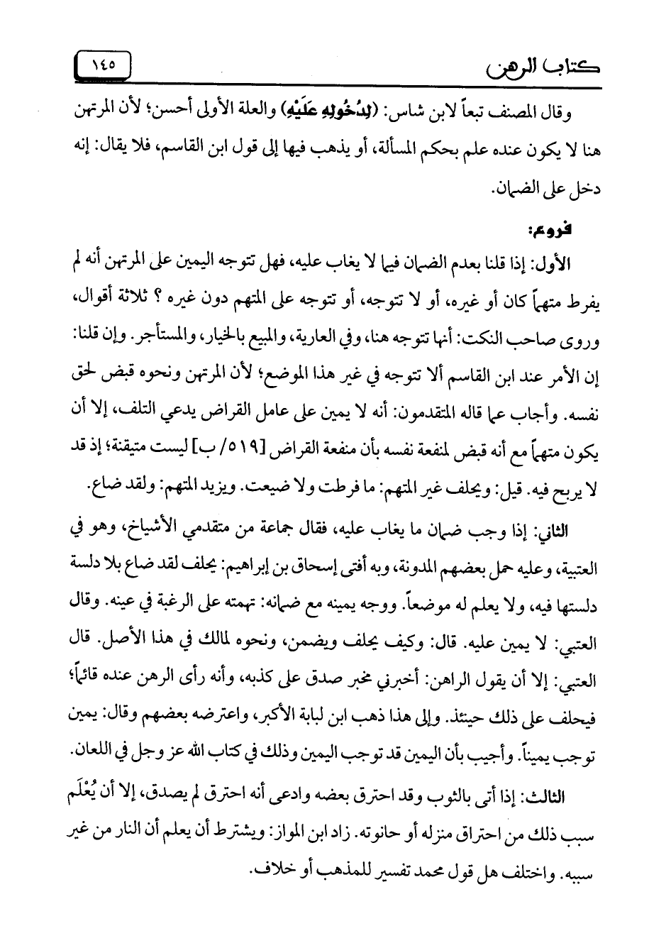 الأول: إذا قلنا بعدم الضمان فيما لا يغاب عليه، فهل تتوجه اليمين على المرتهن أنه لم يفرط متهماً كان أو غيره، أو لا تتوجه، أو تتوجه على المتهم دون غيره؟ ثلاثة أقوال، وروى صاحب النكت: أنها تتوجه هنا، وفي العارية، والمبيع بالخيار، والمستأجر. وإن قلنا: إن الأمر عند ابن القاسم أو تتوجه في غير هذا الموضع؛ لأن المرتهن ونحوه قبض لحق نفسه. وأجاب عما قاله المتقدمون: أنه لا يمين على عامل القراض يدعي التلف، إلا أن يكون متهماً مع أنه قبض لمنفعة نفسه بأن منفعة القراض [519/ب] ليست متيقنة؛ إذ قد لا يربح فيه. قيل: ويحلف غير المتهم: ما فرطت ولا ضيعت. ويزيد المتهم: ولقد ضاع.